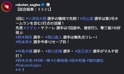 9回のマウンドは守護神の則本投手。テンポよく2アウトをとったものの、そこから2塁打で出塁を許すと直後の初球をレフトスタンドに運ばれて3-2と1点差に詰め寄られます。さらに次の打者には10球粘られてフォアボールを与え同点のランナーを出してしまいますが、最後はスライダーで空振り三振に仕留めてゲームセット。オールスター明けの後半戦初戦を勝利で飾りイーグルスはここから5連勝、ピンクユニもホーム6連勝の快進撃に繋がる、チームを勢いづける勝利となりました。
