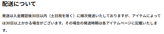 殊更HATTRICKを悪く言うつもりもないのですが、入金から届くまで1か月半はさすがに遅いと感じてしまいます。1か月を超えると欠品商品の再入荷待ちとか海外取り寄せといった印象に近いですからね。ただ、ちゃんとサイト上に記載はあるので運営側に非があるわけではありません。
